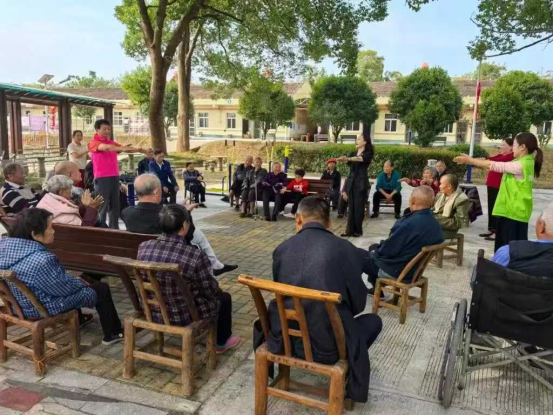 民政社工和志愿者在临澧县四新岗镇敬老院带领老人做手指操