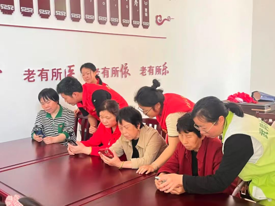 民政社工和志愿者在武陵区芙蓉街道教老人使用智能手机