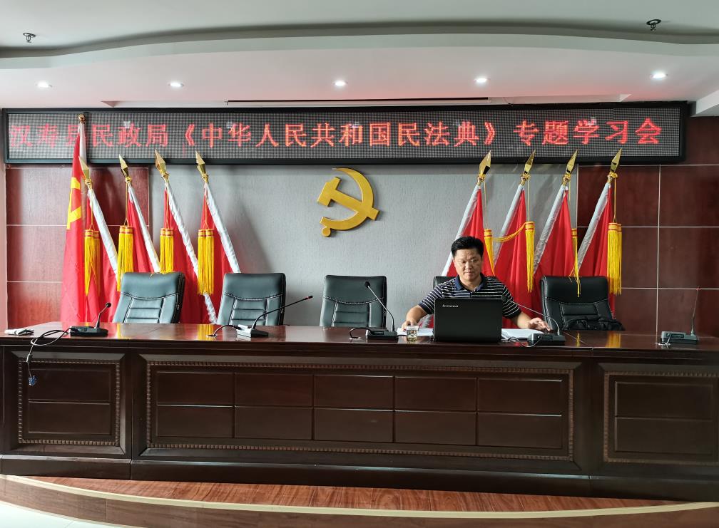 为进一步加强学法用法,提升全局干部职工法治意识和依法行政能力,7月31日上午,汉寿县民政局组织干部职工集中学习《中华人民共和国民法典》,会议由副局长朱诗平主持。邀请了全国模范司法所长、湖南省十佳司法所长、常德市最美司法人、县民政局法律顾问熊友权,围绕民法典的立法历程、重要意义、新增亮点以及民法典与民政工作相关内容,对干部职工作了详细解读。