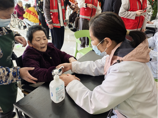 在义诊区,老人正在测量血压
