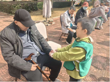 午餐时分,孩子们将热气腾腾的饺子端到老人手中,待老人用餐完毕后,又恭敬地奉上清茶,轻声问候“爷爷奶奶,您慢用”。在感恩献礼环节,孩子们送上亲手制作的贺卡与香囊,齐声说道:“爷爷奶奶,您辛苦了!”稚嫩的话语承载着最纯真的心意,让老人们脸上绽放出幸福的笑容。