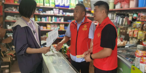 志愿者为门店老板及居民发放宣传手册,讲解相关政策
