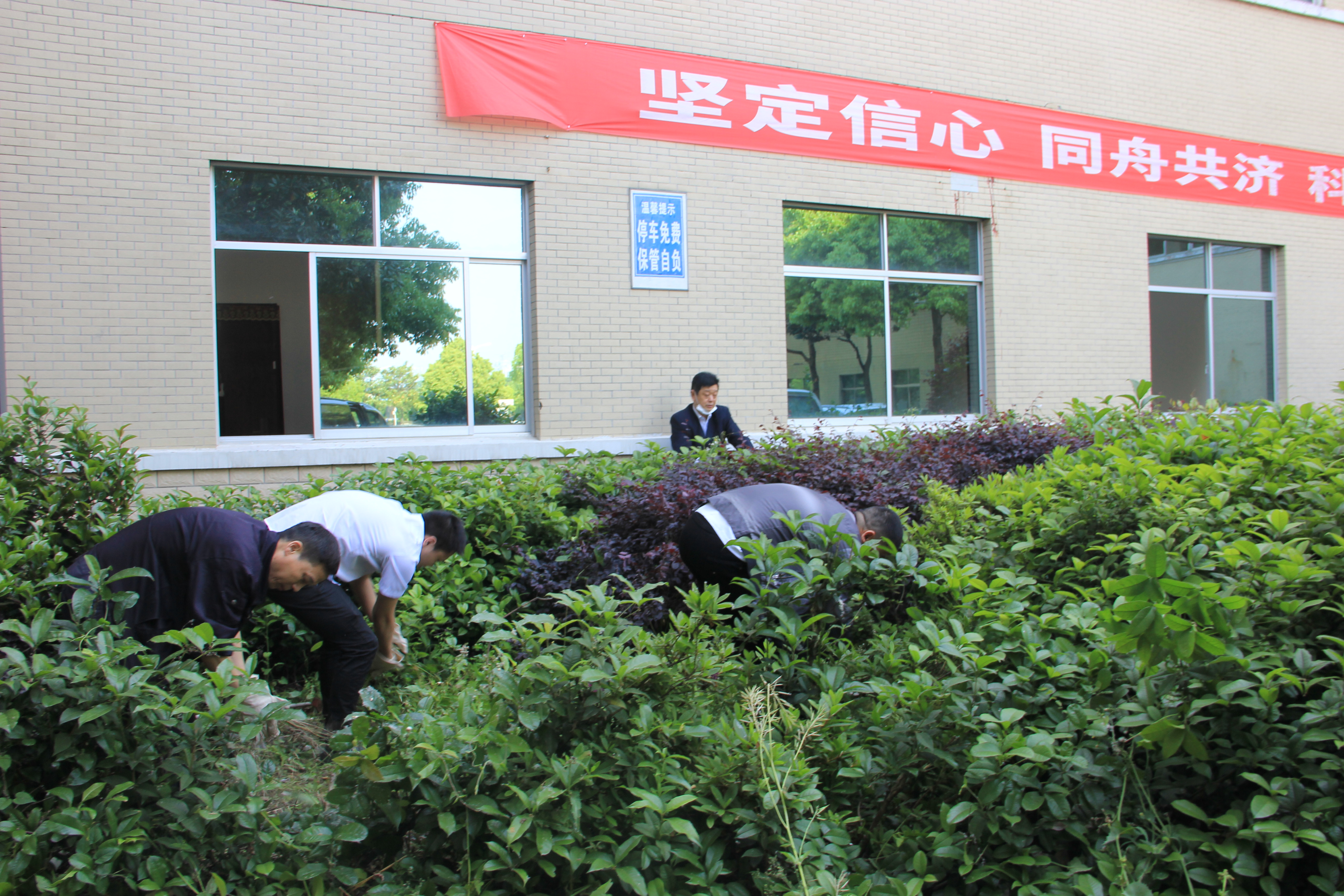 工作人员清除绿化带杂草、清扫办公环境卫生